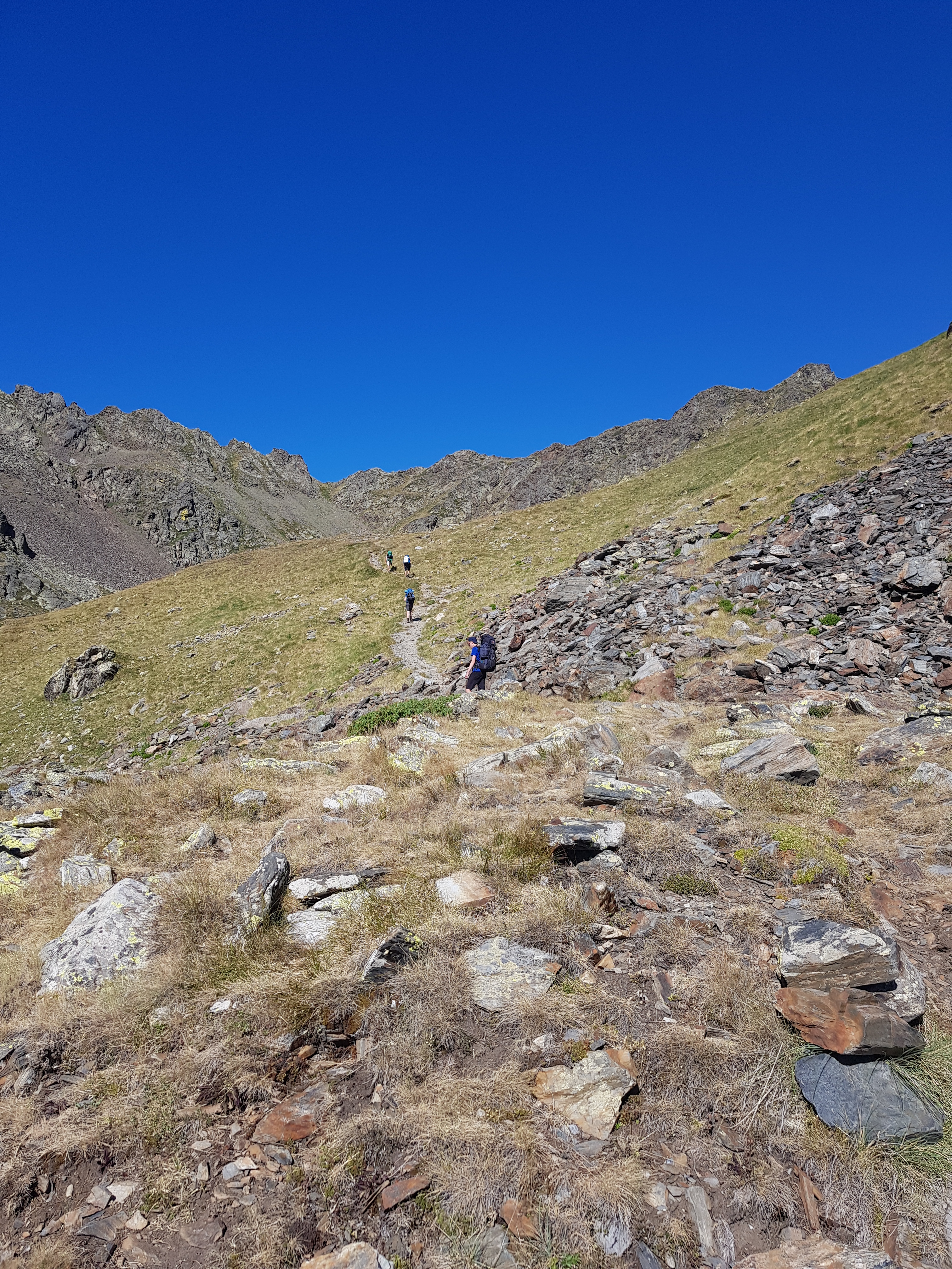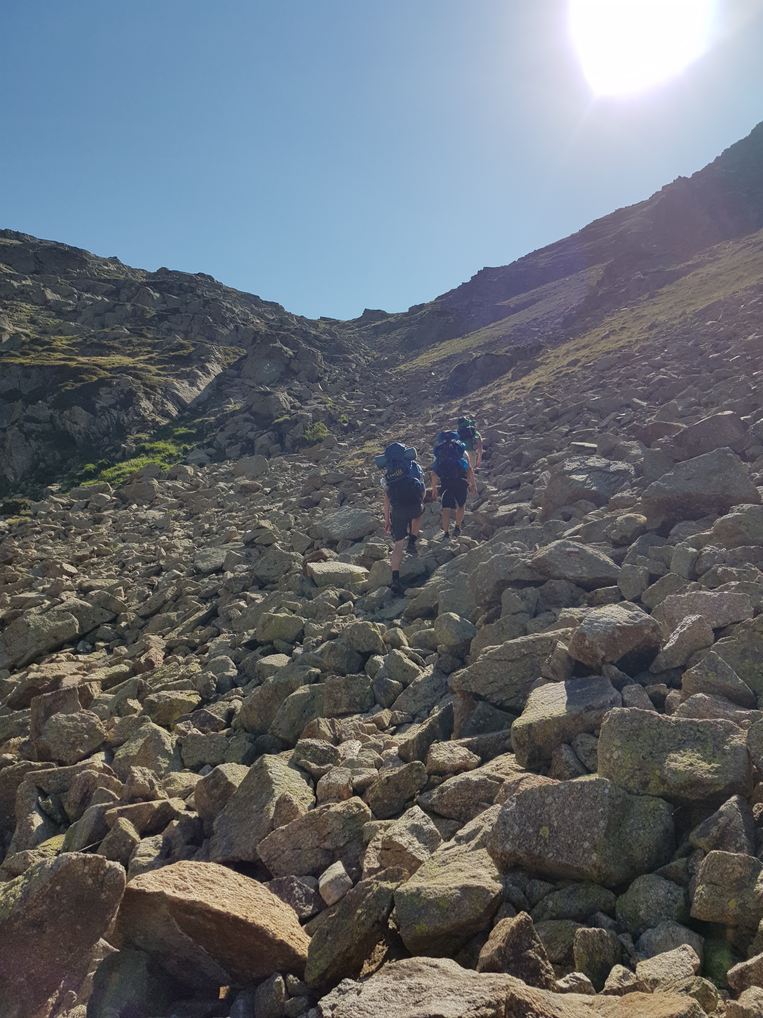 Ráno se nám podařilo vyrazit relativně včas - sluníčko zatím nepražilo, takže byl příjemný chládek. Nicméně hned první kopec byl na východ, tak se chládek okamžitě změnil na vedro. Naštěstí byl v horách suchý vzduch, takže se člověk tolik nepotil. Hned v prvním kopci se také projevila první komplikace - začal se mi dělat puchýř, takže jsem zbytek výletu každý ráno čtvrt hodiny zalepoval patu vrstvou náplastí.