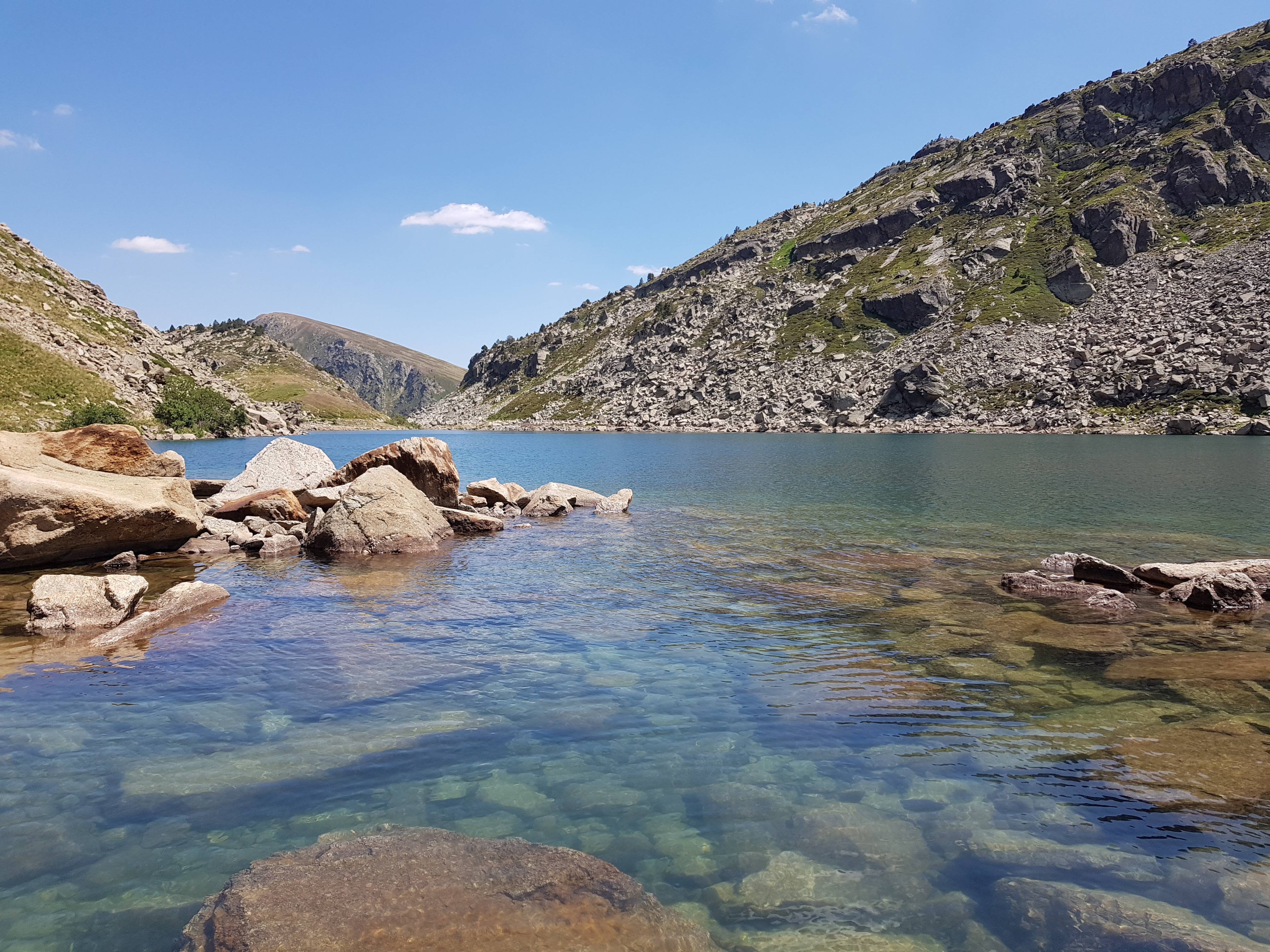 Před překročením hranic do Andorry nás ještě čekal poslední krpál. Vzhledem k tomu, že nám už docházela voda, tak jsme se rozhodli dát si před ním ještě půlhodinkovou pauzu u jezera na přefiltrování vody přes Matějův filtr. Horská jezera a potůčky by se asi daly pít jen tak, ale přes filtr jsme mohli čistit vodu téměř neomezeně, jen to vždy zabralo chvíli času, tak jsme nechtěli riskovat žádné zažívací potíže.