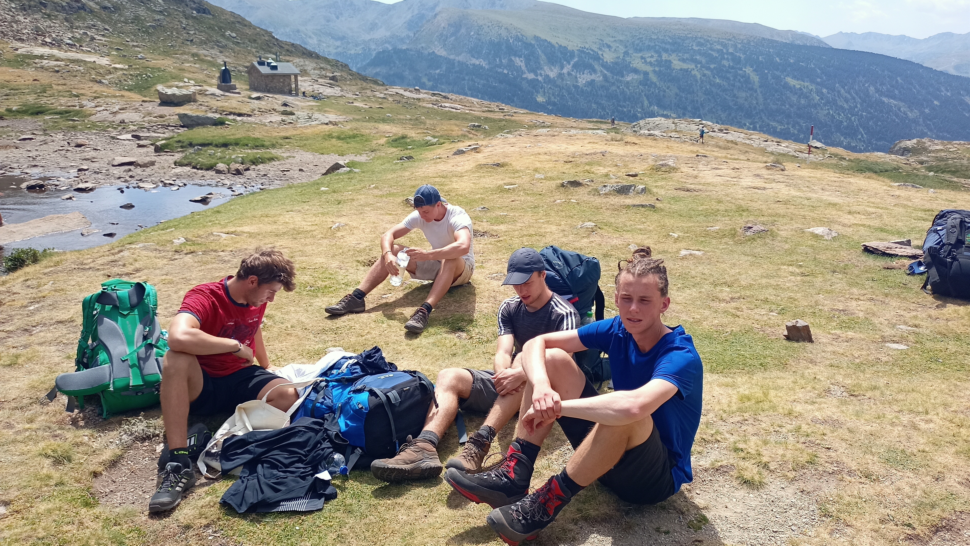 Začínalo už být nesnesitelné vedro, tak jsme se rozhodli zastavit se v jedné cabaně na oběd. Protože času bylo dost, tak nám to trvalo snad dvě hodiny. Mezitím tam přišli přenocovat dva různí horalové, přičemž jeden dokonce uměl anglicky a řekl nám, že patří mezi ty magory, co se snaží za měsíc přejít od Atlantiku ke Středozemnímu moři.