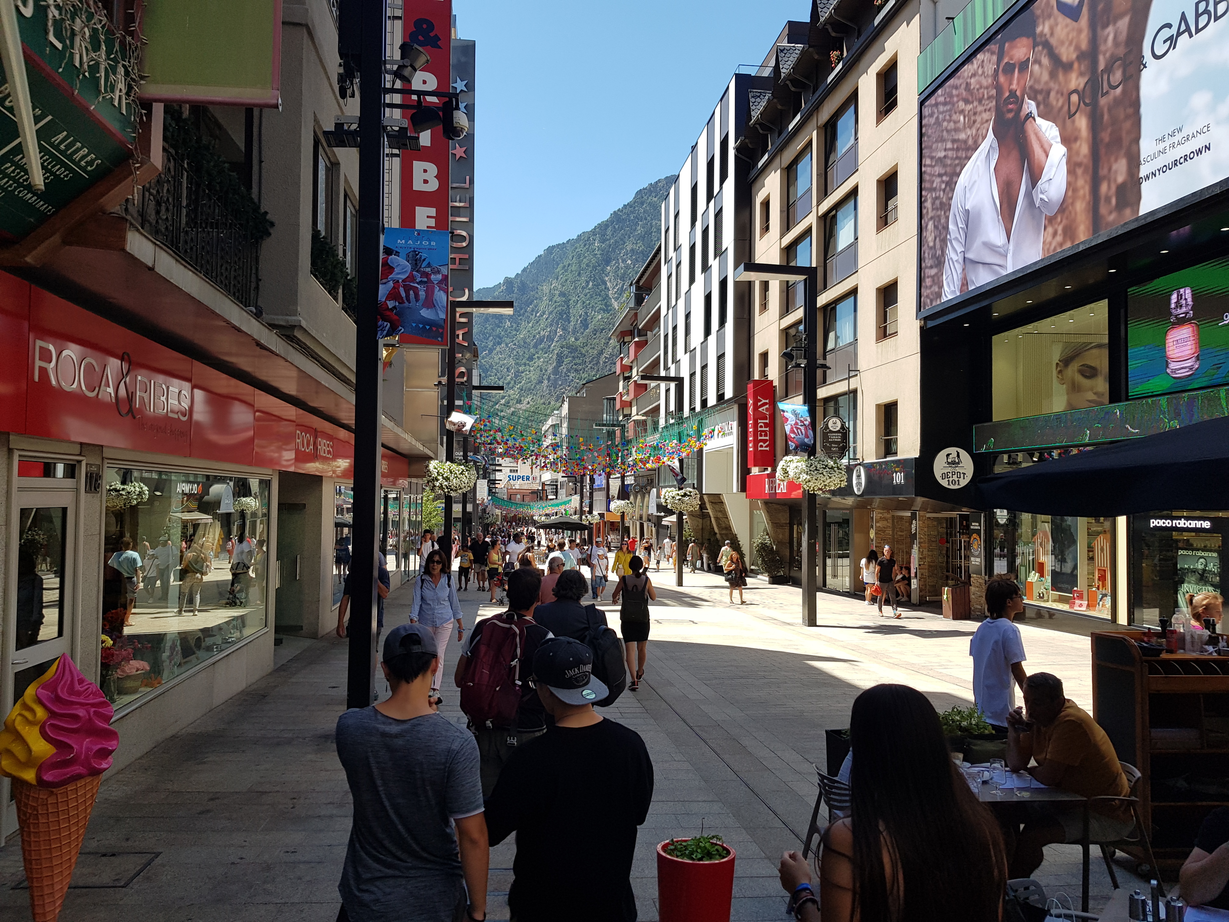 Poté jsme prošli hlavní nákupní třídu. Andorra mimo horskou turistiku a zimními sporty také láká návštěvníky na nízké daně. V případě hlavního města jsou však bezpečně dorovnány marží obchodníka, takže se stalo, že jsme si v supermarketu omylem koupili jablka za 4€/kg.