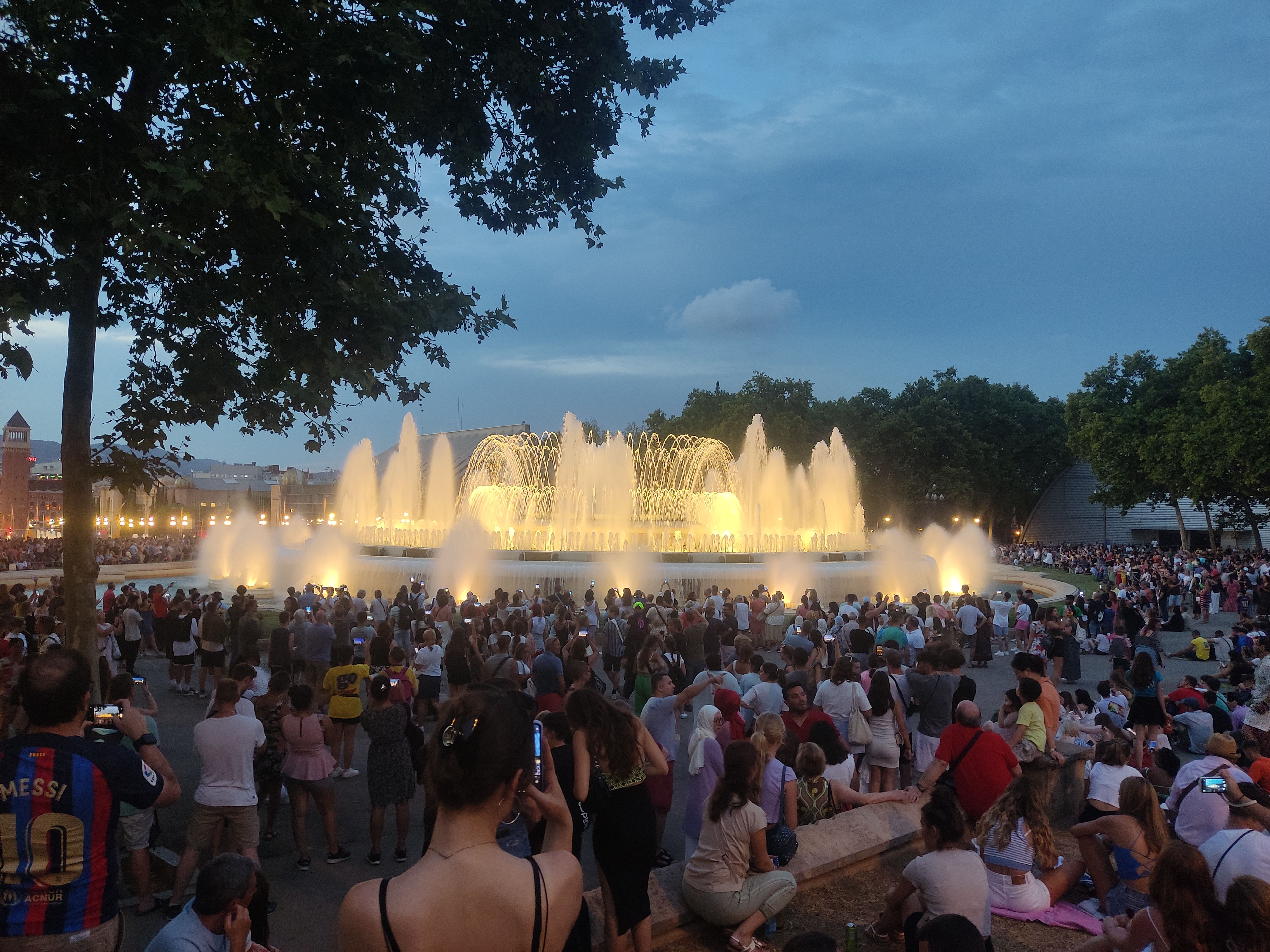 Jak se naše vzdálenost od fontány zmenšovala, tak v nepřímé úměře k tomu rostla hustota davu, až přímo u fontány téměř nebylo k hnutí. Lidé posedávali všude: na schodech, na zábradlích, děti i na stříšce jednoho stánku. Povedlo se nám najít volný plácek se slušným výhledem na jednom kousku trávníčku vedle keřů. Všude kolem pobíhali pouliční prodejci vody, Coca-Coly, piva a jiných nápojů v plechovkách či PET lahvích. Později se ukázalo, že v keři za námi mají schované zásoby.