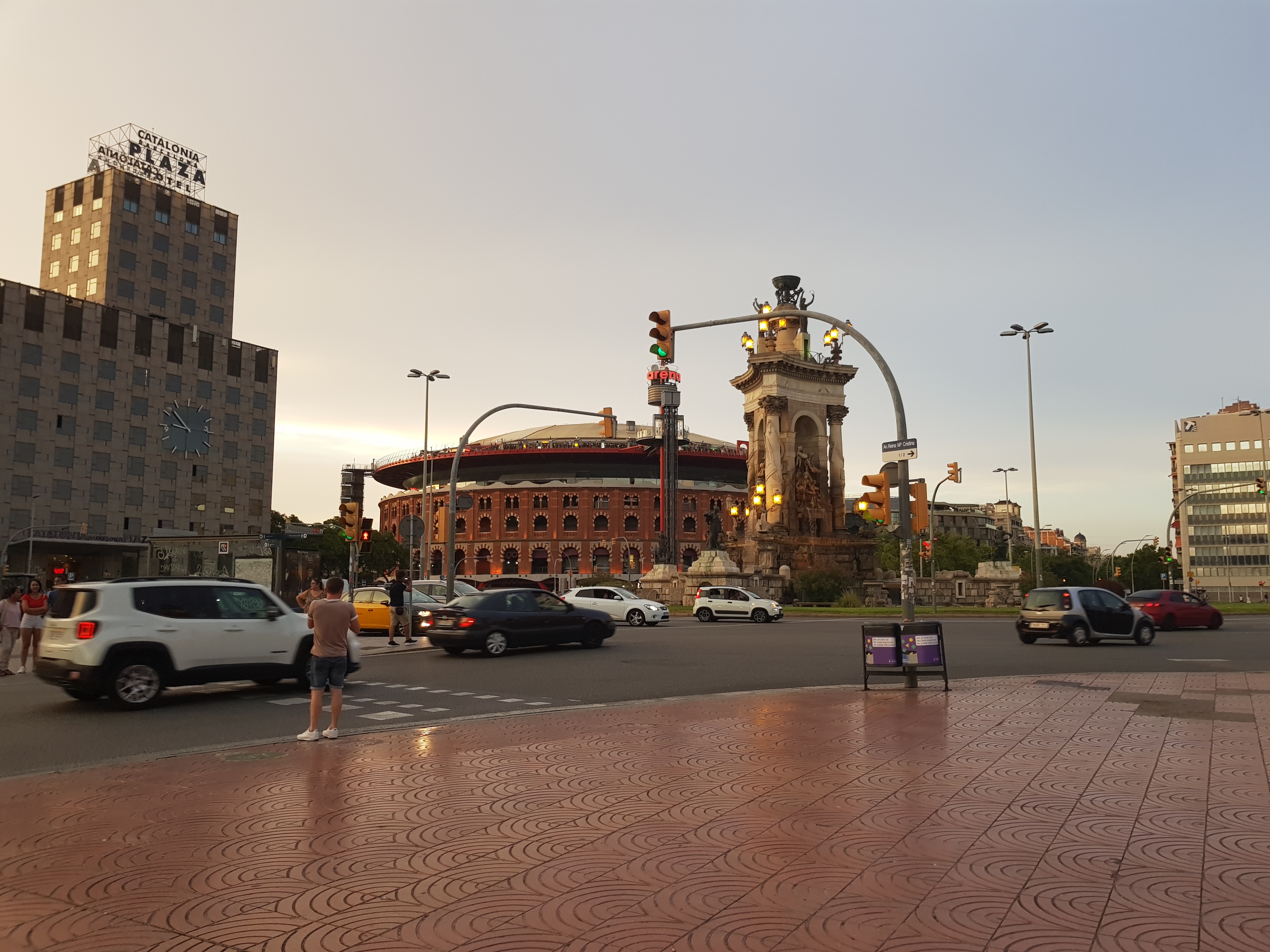 Cestou jsme prošli kolem Plaça d’Espanya s arénou na býčí zápasy (vzadu), dnes přestavěnou na nákupák