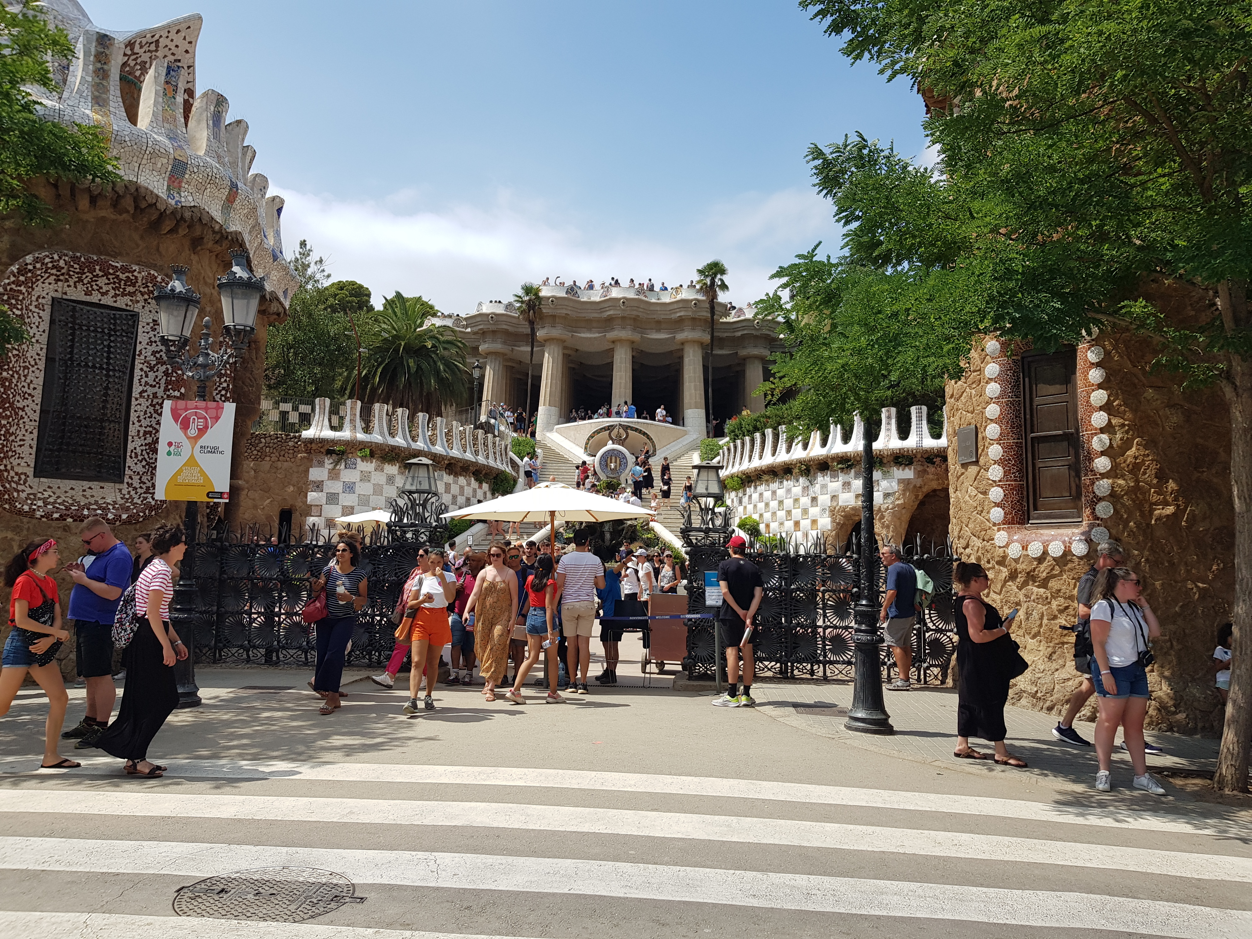 Následně naše kroky konečně směřovaly do parku Güell. Vzhledem k netradičnímu směru, ze kterého jsme se k parku blížili a několika zkratkám jsme narazili na vnější stranu oplocení parku. Pár metrů doleva akorát přelézal prodavač PET lahví s vodou plot pro další zásoby, ale my jsme se rozhodli takovými hovady nebýt a jeho příkladu nenásledovat. Došli jsme tedy k nejbližšímu vstupu, kde nám bylo oznámeno, že lístky jsou pro dnešek vyprodané.