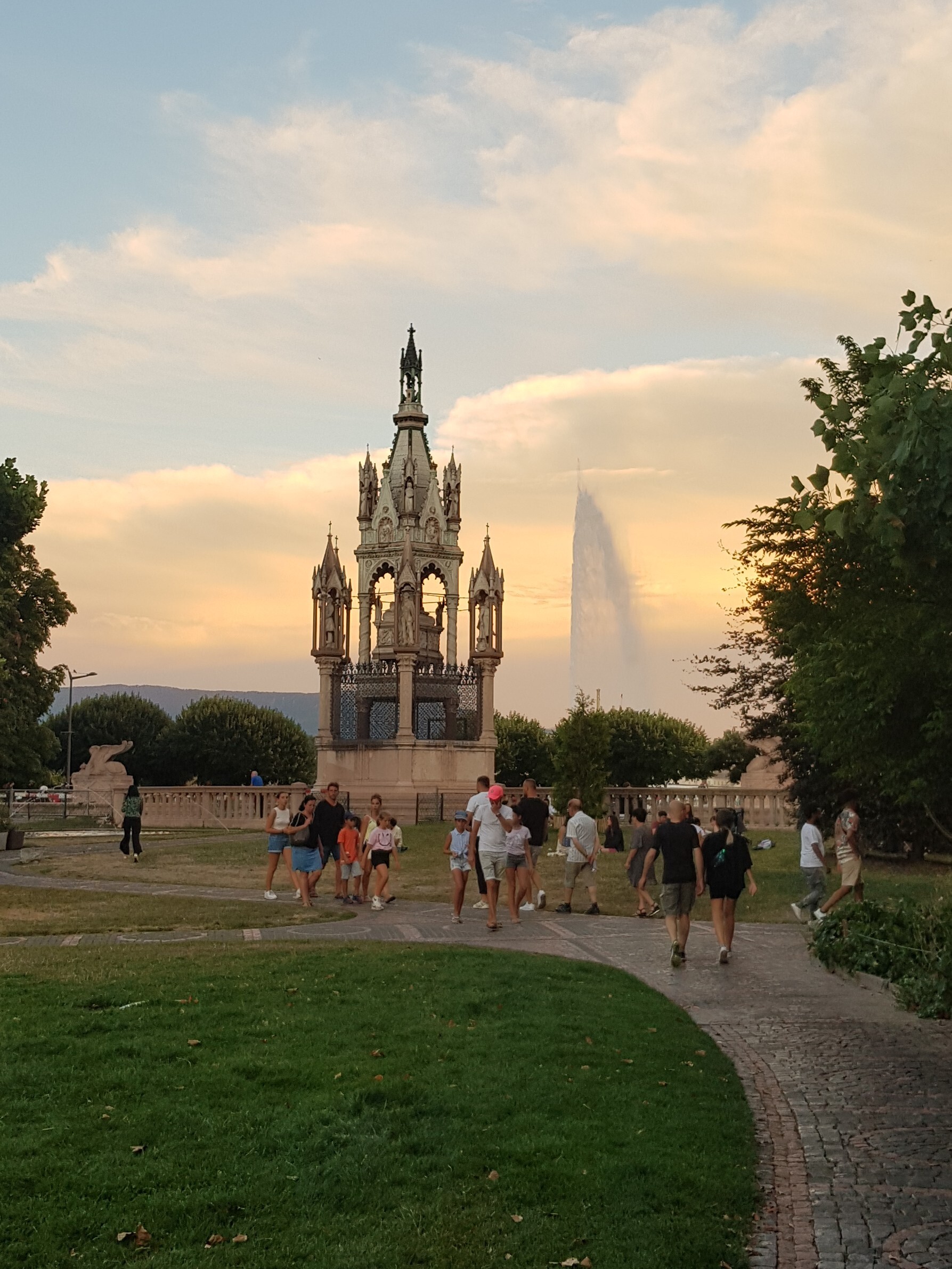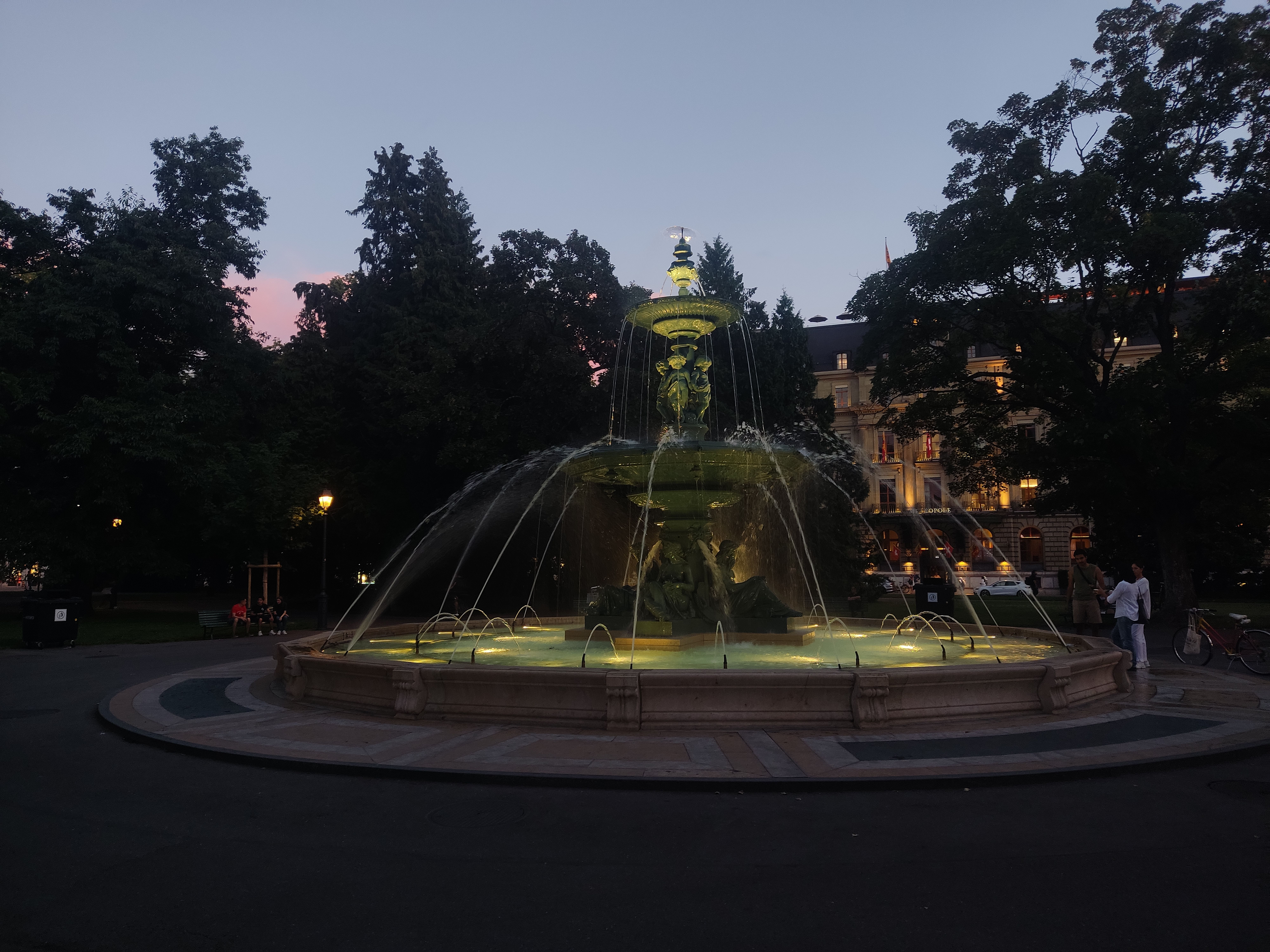 S až nepříjemně plným žaludkem jsme znovu zamířili do parku obhlédnout, jak pokračuje část oslavy určená mladé části populace (a také umýt kotlík v pítku). Všude v parku posedávaly skupinky mladých, uprostřed byly rozmístěny stoly a lavice na sezení a prodávalo se pivo. Dostal jsem chuť místní pivo ochutnat, ale jak jsem spatřil cenu 8€ za 0,4l tak mě rychle přešla a raději ochutnám dvě až tři v Německu. Ještě jsem prohodil pár slov s nějakým místním studentem, abych se dozvěděl, co se vlastně slaví a dostal doporučení kam se zajít podívat. K našemu zklamání nám pověděl, že tu krom vodotrysku, CERNu a historického centra moc k vidění pro cestovatele našeho ražení není.